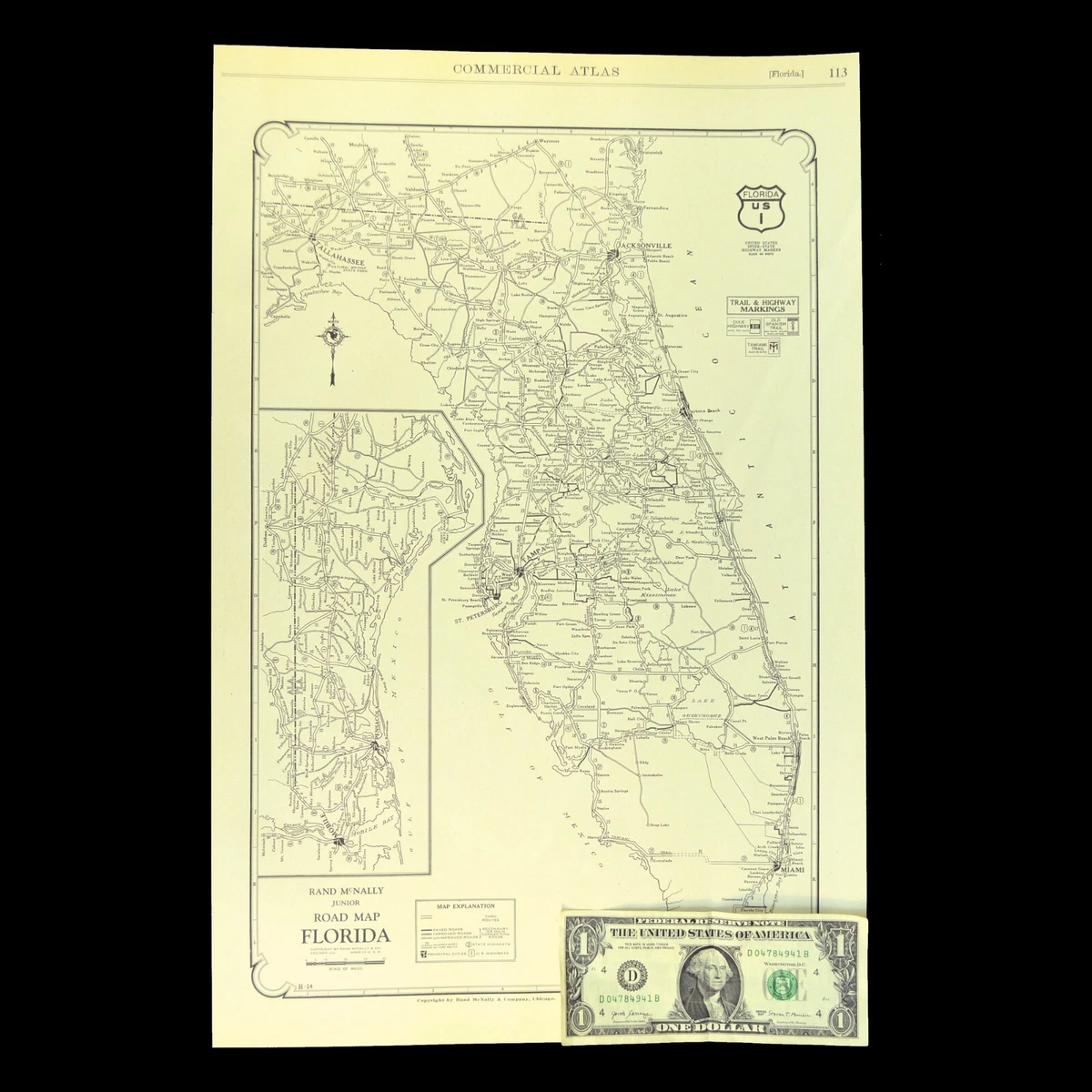 Vintage FLORIDA Map Highway Auto Trails LARGE US Route 1