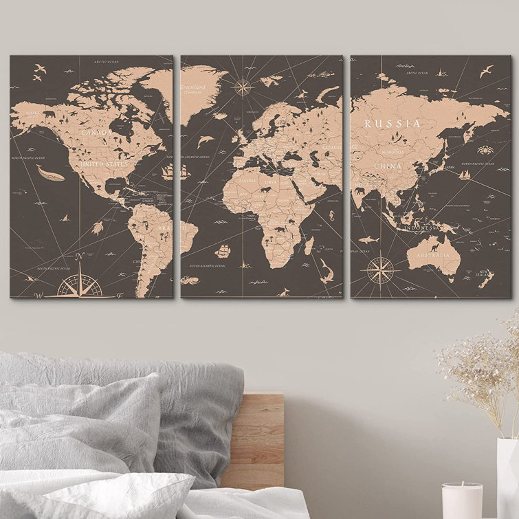 IDEA4WALL Sepia World Map Global Country Framed On Canvas 3 Pieces